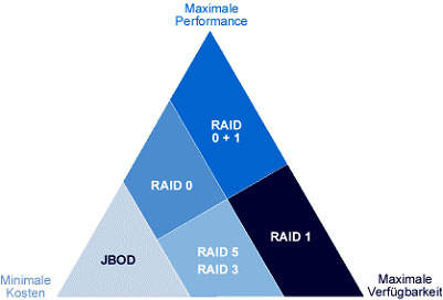 Die Auswahl des RAID Levels erfordert eine genaue Abwägung zwischen den Faktoren Verfügbarkeit, Performance und Kosten pro Mbyte. Fasst man diese Faktoren zusammen, ergibt sich das typische RAID-Dreieck wie in unten stehender Abbildung.